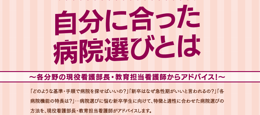 「どのような基準・手順で病院を探せばいいの?」「新卒はなぜ急性期がいいと言われるの?」「各病院機能の特長は?」病院選びに悩む新卒学生に向けて、特長と適正に合わせた病院選びの方法を、現役看護部長・教育担当看護師がアドバイスします。