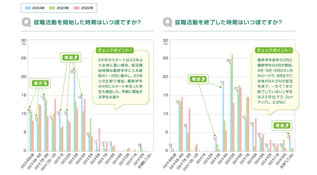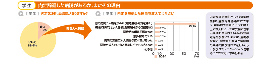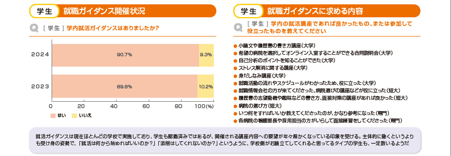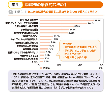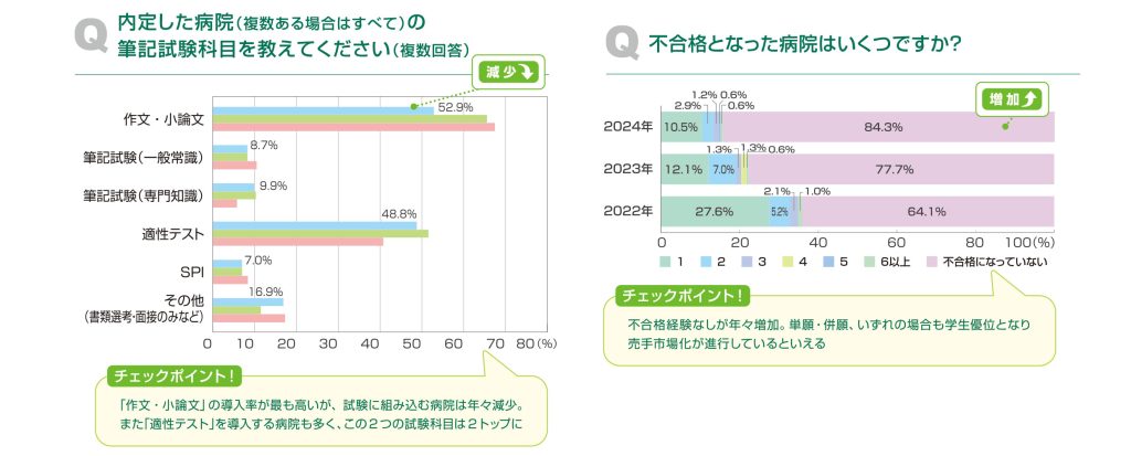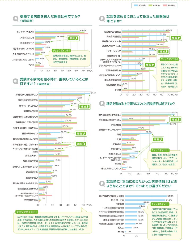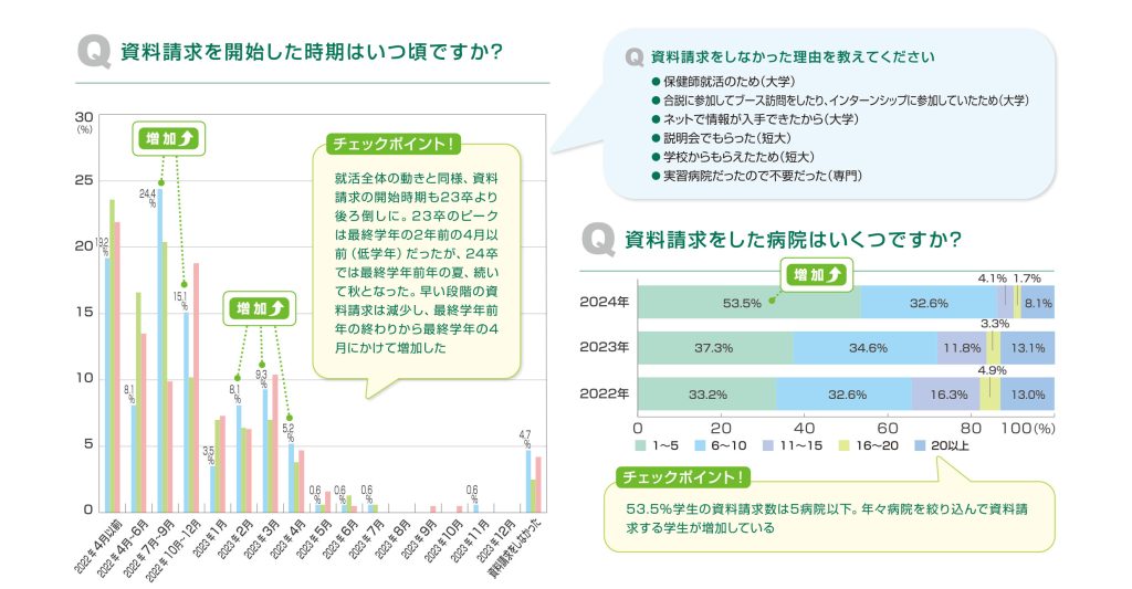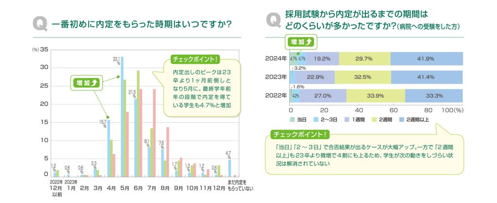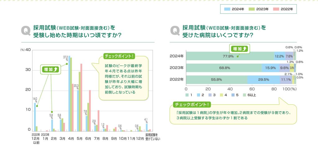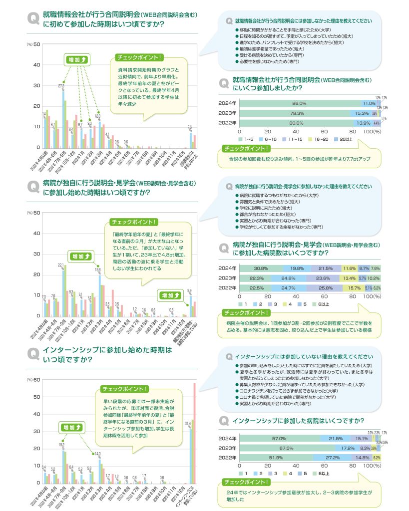24卒の就活は前年より1か月程度前倒し。対面イベント・病院説明会・インターンシップに参加しつつ病院選びは慎重傾向。将来性や安定性、給与・休日などの待遇面などを重視した病院選びの傾向が強まっています。