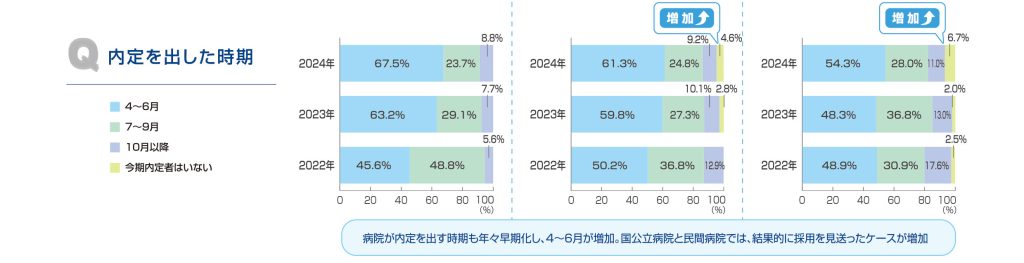 ・内定時期は病院形態問わず4~6月が半数以上、早期化は進む