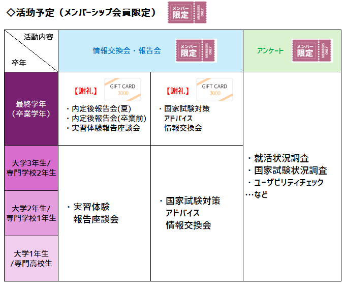メンバーシップ会員になると、レアな情報交換会や座談会に参加できる特典のほか、卒業年になると謝礼がもらえる情報緩解や座談会が待ってます。